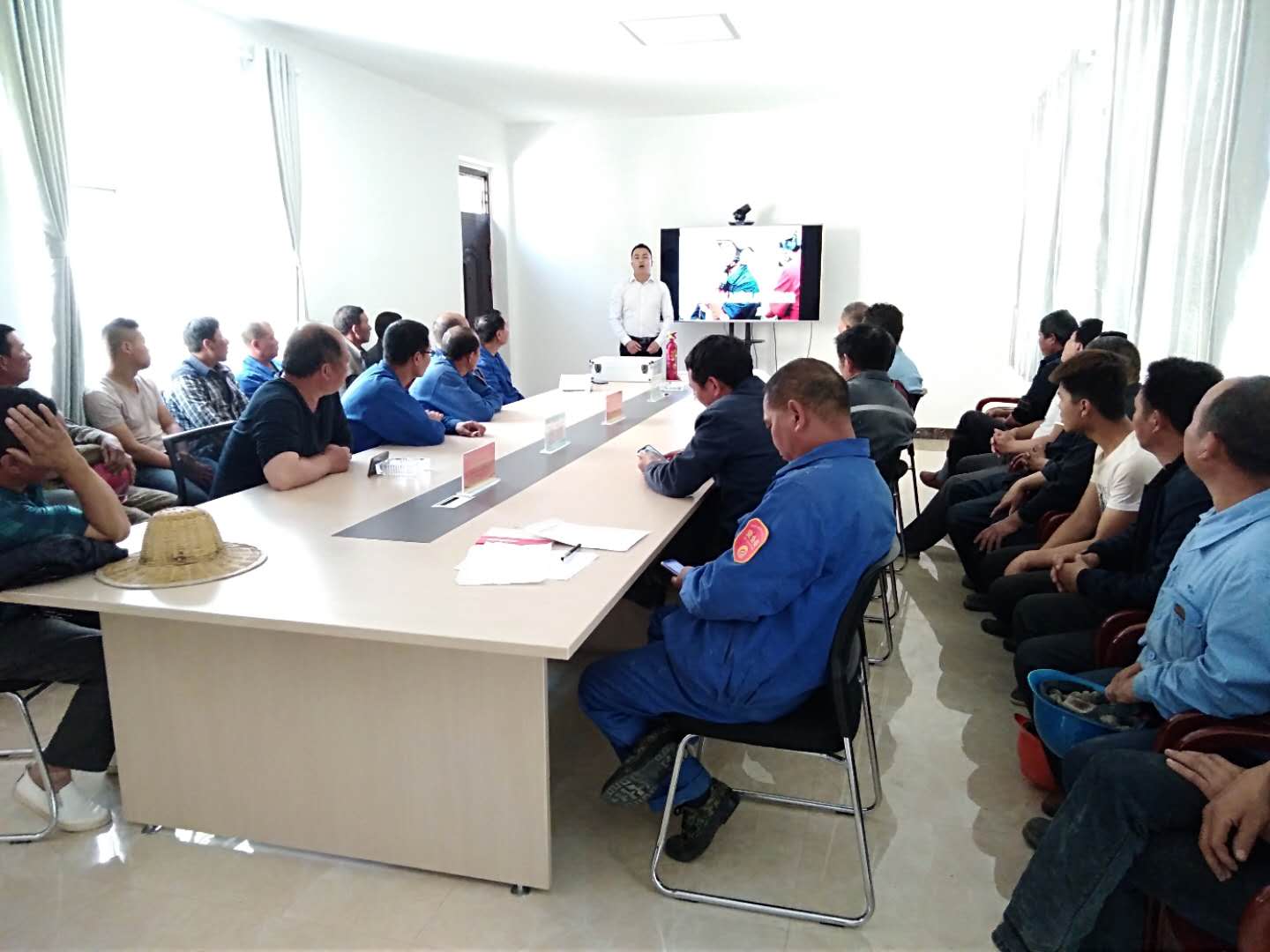 此次演練特邀請河南省消防培訓中心教官,對參演人員針對露天礦山開采易發(fā)生的滑坡、坍塌、車輛、火災典型事故案例及消防、人員急救知識進行了視頻課件教學培訓。參加人員有礦山車間和現(xiàn)代爆破公司共計30余人參加。